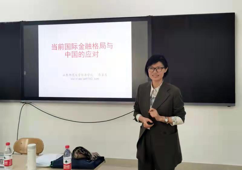 11月25日下午,龙山大讲坛第13期在圣井校区5302教室进行。本期龙山大讲坛邀请山东师范大学经济学院执行院长乔翠霞教授担任主讲嘉宾,以“当今国际金融格局与中国的应对”为主题,由李启航老师主持,永利yl23455全体本科生参加。